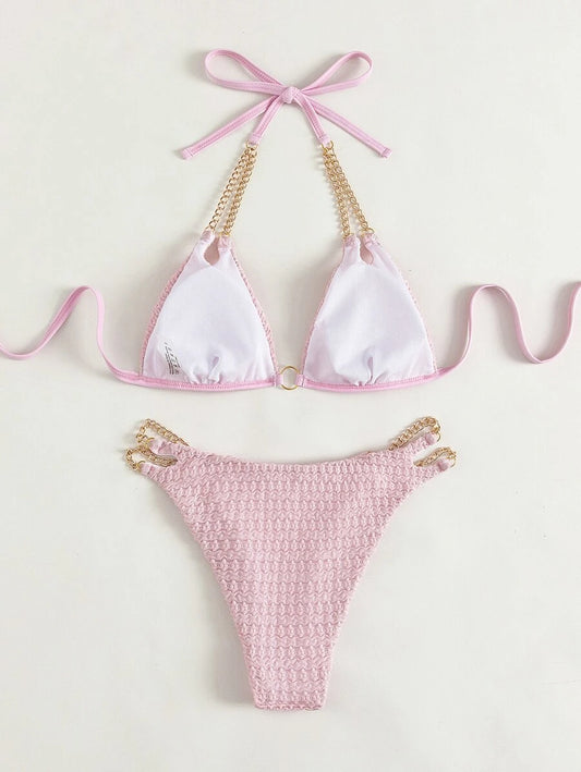 SHEIN Swim Conjunto de Maiô Bikini Texturizado de Praia de Verão, Top de Bralete Triângulo com Corrente Conectada e Maiô Bikini de Peça Única com Recorte Sexy em 2 Partes
