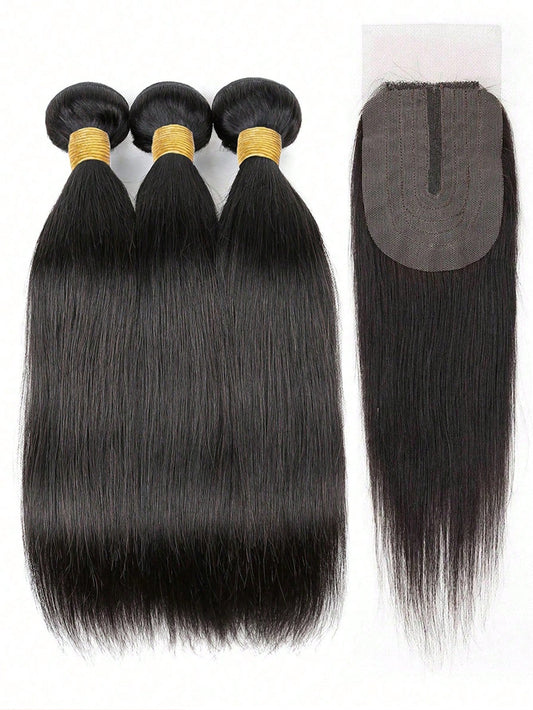4pcs 4 X 4 Lace Closure Straight Human Hair Bundles With Closure Virgin Hair Extension Closure And 3 Bundles Real Double Weft Hair Weave Cheap Hair Daily Use Natural Black Color