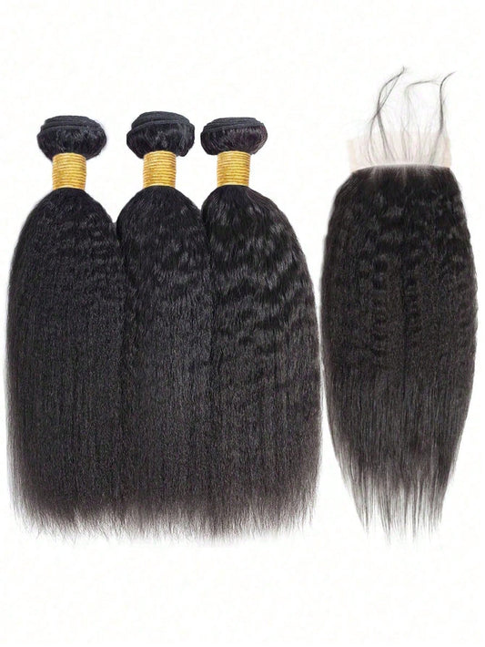 4pcs 4 X 4 Lace Closure Kinky Straight Human Hair Bundles With Closure Virgin Hair Extension Closure And 3 Bundles Real Double Weft Hair Weave Cheap Hair Daily Use Natural Black Color
