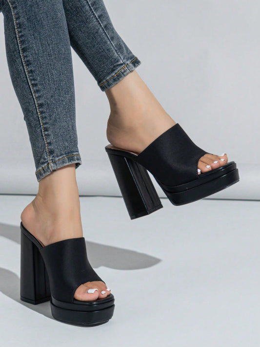 Women Minimalist Platform Chunky Heeled Mule Sandals, Elegant Summer Black Solid Heeled Sandals