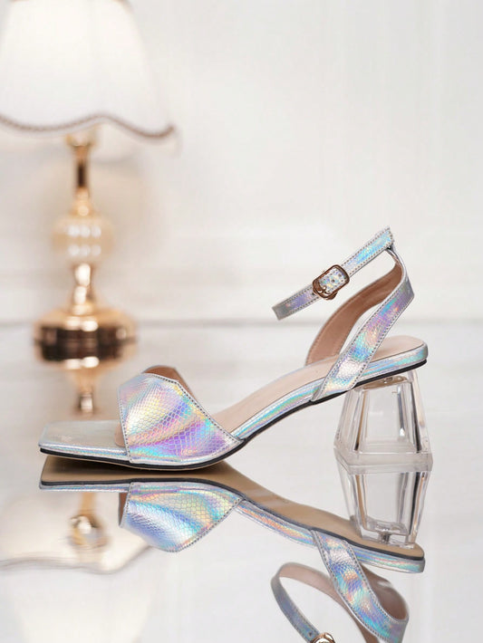 Fashionable Women's High-heeled Sandals - Laser Light Blue, Thick Heel, Square Headed, Snake Print, Party Or Career