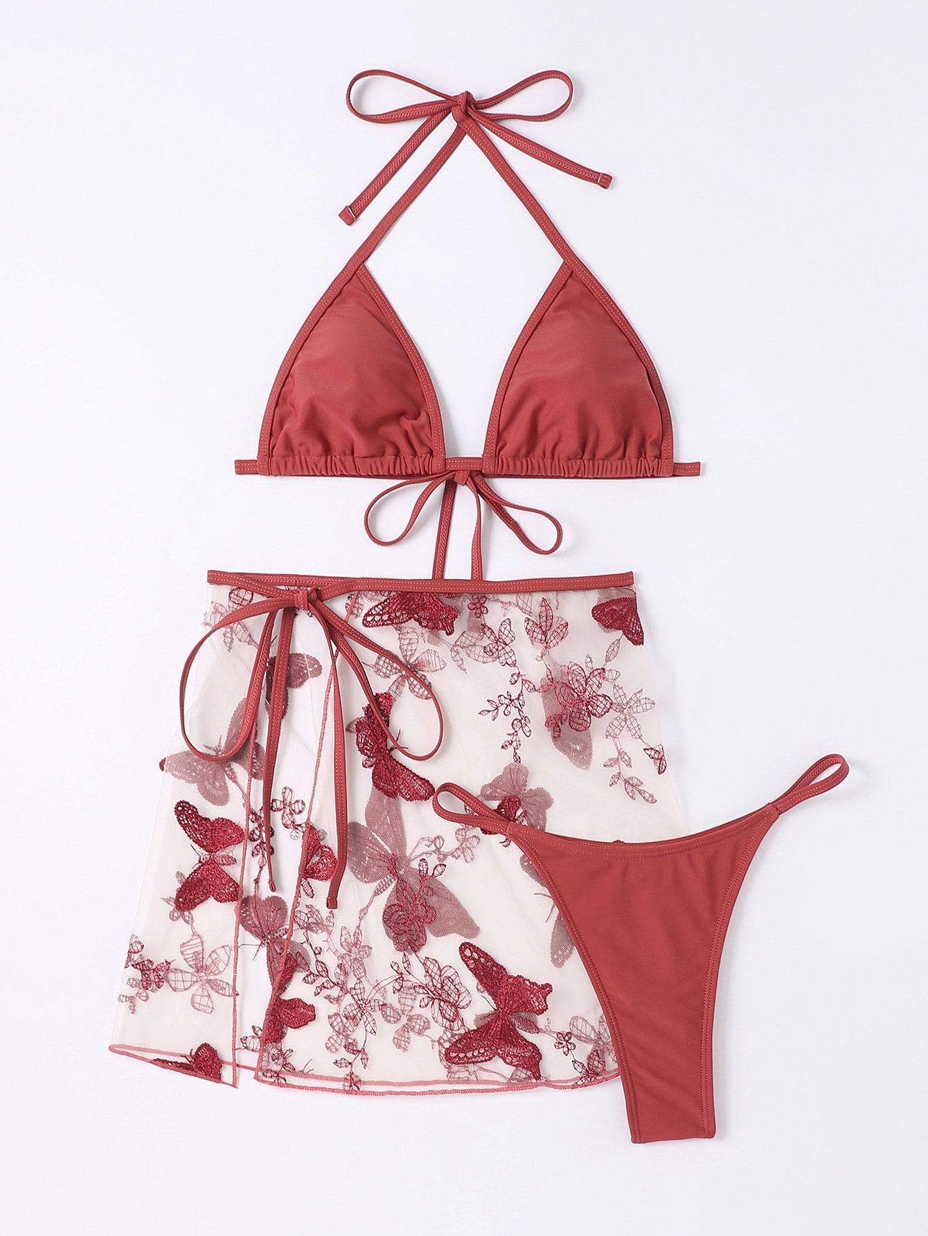 Butterfly and Floral Embroidery Mesh Bikini Set Halter Triangle Bra Top & G-string Bikini Bottom & Skirt 2 Piece Swimsuit