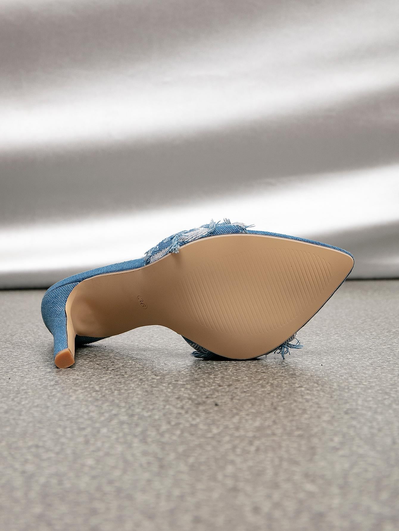 Women Checkered Pattern Raw Trim Stiletto Heeled Sandals, Fashionable Denim Mule Sandals For Summer