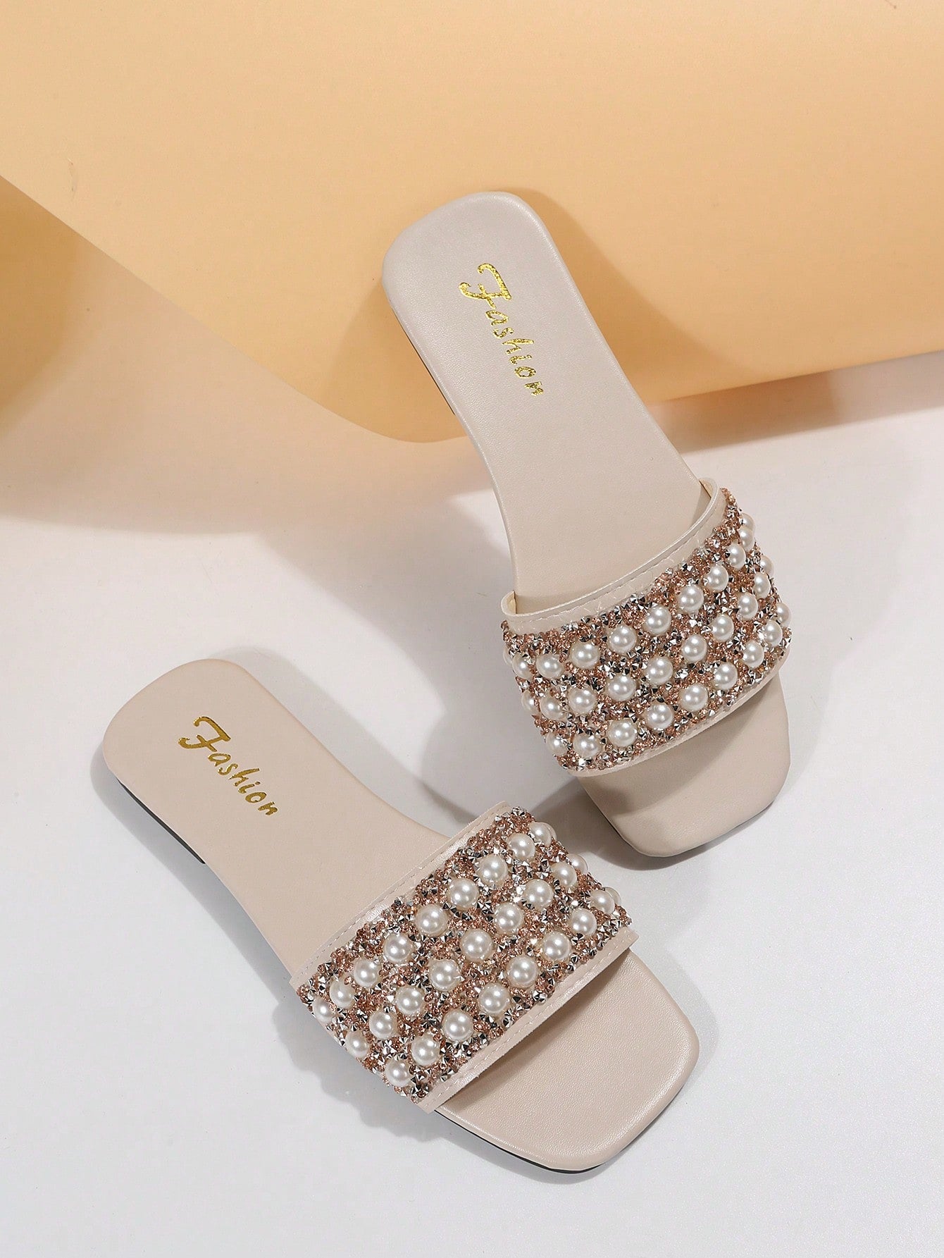 Women Rhinestone & Faux Pearl Decor Slide Sandals, Glamorous Sandals